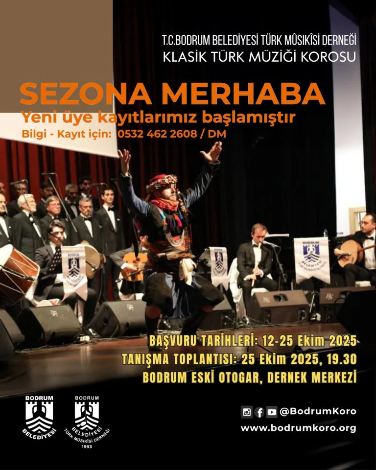 Bodrum Belediyesi Türk Mûsıkîsi Derneği Klasik Türk Müziği Korosu; müzik sevgisi ile hemhâl, her yaştan ve meslek gruplarından gönül dostlarından oluşan topluluğa katılmak isteyen sanatseverleri, 25 Ekim 2025 Cumartesi, saat 19.30’da Bodrum Eski Otogar’da yer alan çalışma salonundaki buluşmaya davet ediyor.