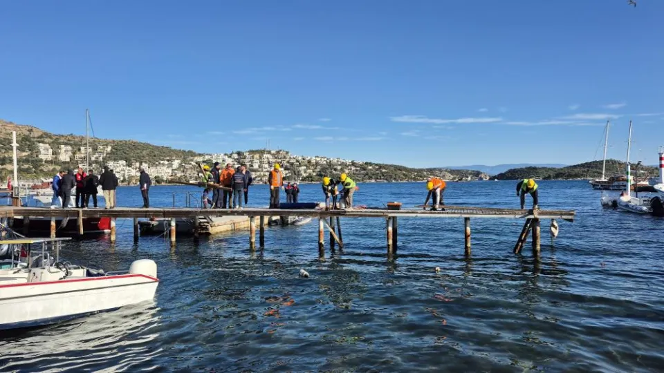İskelenin ön kısmında yer alan 6 yüzer iskelenin (ponton) de bağlantıları dalgıç yardımıyla kesilip tekneyle açığa çekildi.