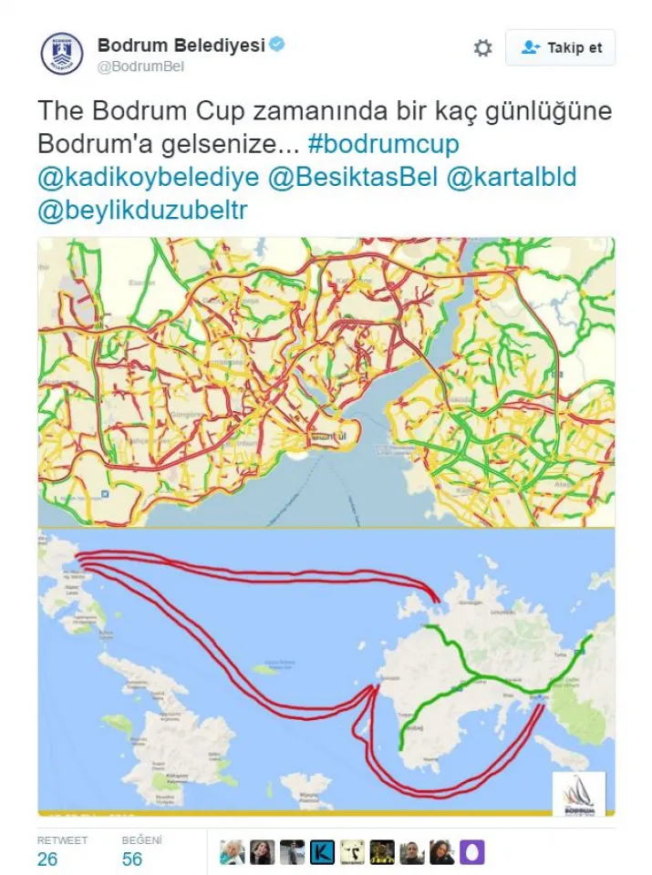 Bodrum Belediyesi sosyal medya hesapları yine çok konuşulan, yüzleri güldüren bir ileti paylaştı. Bodrum Belediyesi resmi Twitter hesabından geçtiğimiz günlerde paylaşılan twitte Kadıköy Belediyesi, Beşiktaş Belediyesi, Kartal Belediyesi ve Beylikdüzü Belediyesi hesapları etiketlenerek İstanbullular Bodrum Cup’ın düzenleneceği tarihlerde Bodrum’a davet edildi.