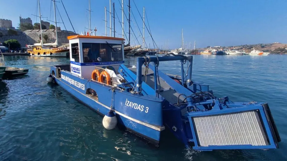 Kocaeli Büyükşehir Belediyesi ekipleri, orman yangınları nedeniyle sahilleri kirlenen Muğla'nın Bodrum ilçesinde deniz süpürgesi ile 5 metreküp çöp topladı.