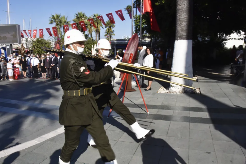 Marmaris Kaymakamı Ertuğ Şevket Aksoy, Aksaz Deniz Üs Komutanı Tuğamiral İbrahim Kurtuluş Sevinç, Marmaris Belediye Başkanı Mehmet Oktay, Marmaris Cumhuriyet Başsavcısı Nuh Mete Hatipoğlu, anıta çelenk sundu. Cumhurbaşkanı Recep Tayyip Erdoğan’ın 30 Ağustos Zafer Bayramı mesajı okundu.