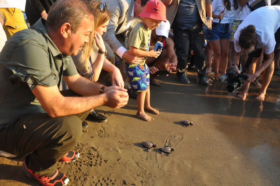 Uydu takip cihazı takılan caretta carettalar ile yeşil deniz kaplumbağası suya salındı. Ayrıca, yuvadan geç çıkan ve denize ulaşamayan 20 yavru kaplumbağa da denizle buluşturuldu.
