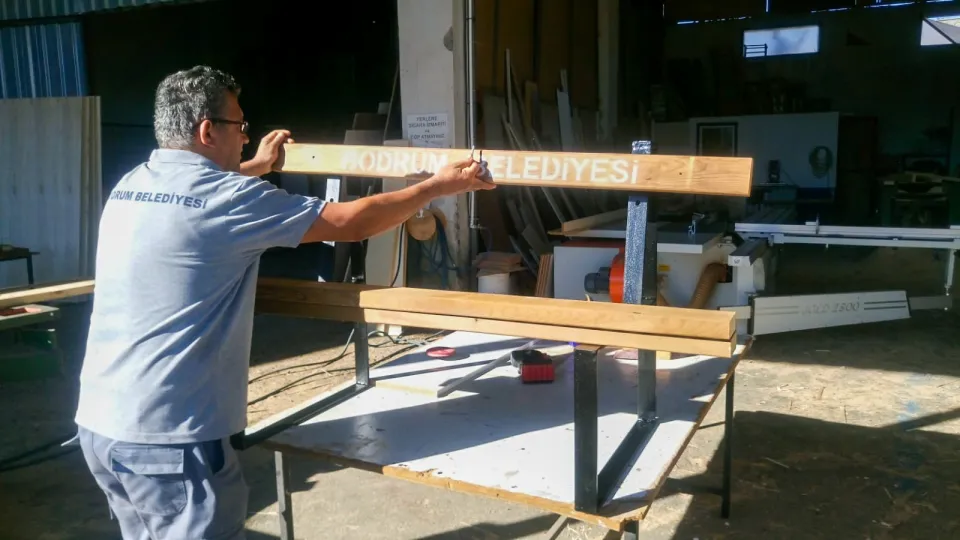 Bodrum Belediyesi, ilçe genelindeki hizmet binalarında ve peyzaj düzenlemelerinde kullanılan mobilyaların üretimini kendi atölyelerinde gerçekleştiriyor.
