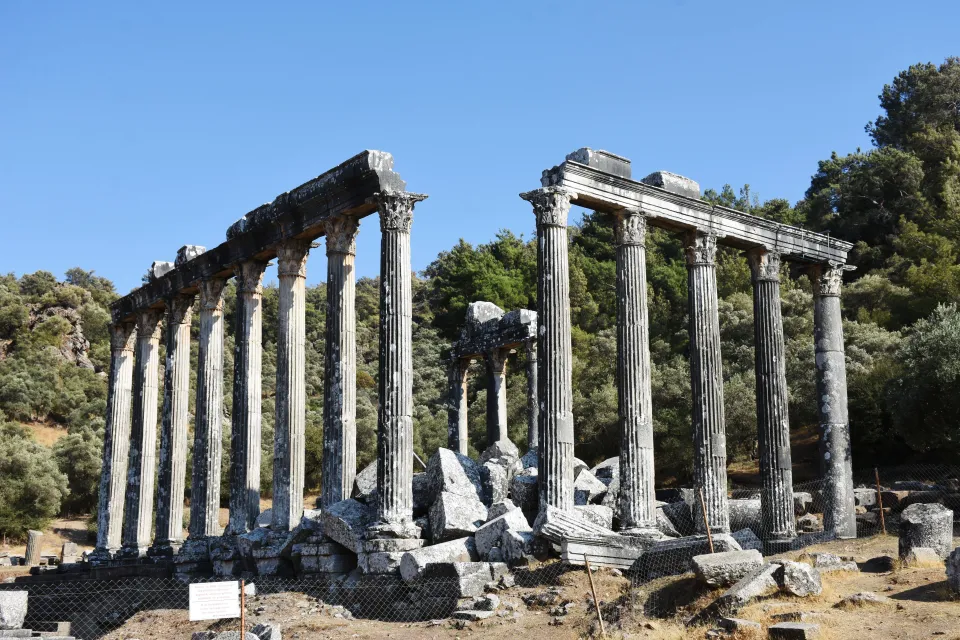 Selimiye Mahallesi'ndeki, milattan önce 2'nci yüzyılda inşa edilmiş Euromos Antik Kenti'nde kazılar devam ederken, kentte bulunan 1860 yıllık Zeus Lepsynos Tapınağı'nın zamana yenik düşmüş sütunlarının yeniden dikilmesi için de çalışma yürütülüyor.