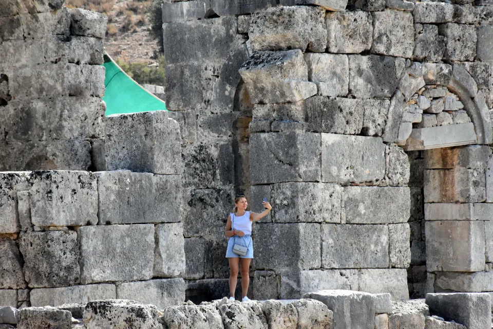 Ziyaretçiler, UNESCO Dünya Mirası Geçici Listesi'nde bulunan 2 bin 400 yıllık kaya mezarlarını görüyor, 5 bin kişilik tiyatroda soluklanıyor.
