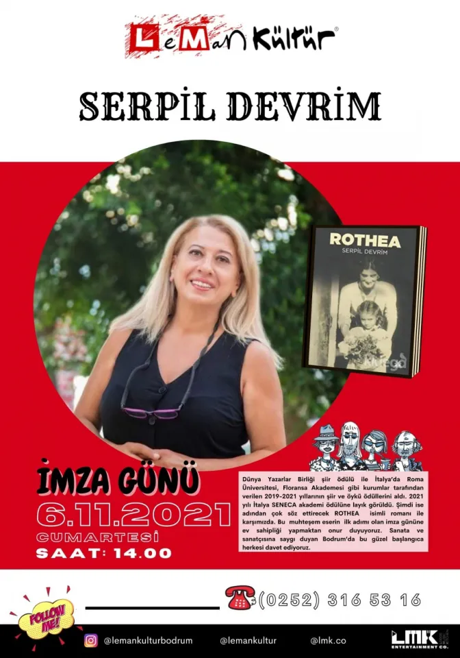 Dünya Yazarlar Birliği Şiir Ödülü, İtalya’da Roma Üniversitesi, Floransa Akademi gibi akademik kurumlar tarafından verilen şiir ve öykü ödülleri ile 2021 yılında İtalya Seneca Akademi Ödülü’ne layık görülen Serpil Devrim, adından çok söz ettirecek son kitabı “Rothea”yı, ilk önce Bodrumlu okurları için imzalayacak. Kitabın 6 Kasım 2021 Cumartesi günü gerçekleştirilecek ilk imza günü Leman Kültür’de saat 14.00’te başlıyor. Bu özel buluşmaya, sanata ve sanatçısına saygı duyan tüm Bodrum halkı davetli.