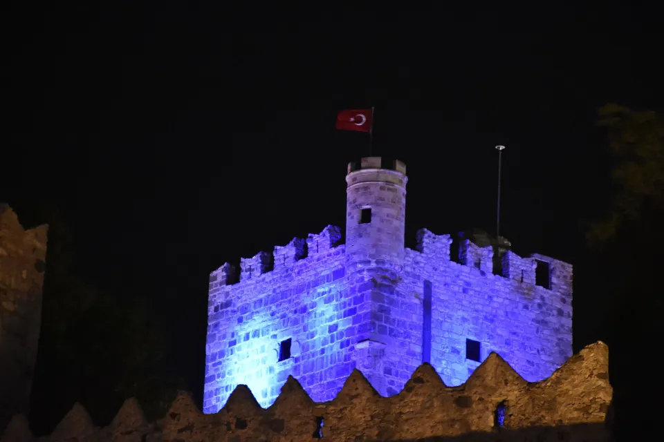 Tarihi Bodrum Kalesi'ndeki Fransız Kulesi, 20 Kasım Dünya Çocuk Hakları Günü dolayısıyla mavi ışıkla aydınlatıldı.