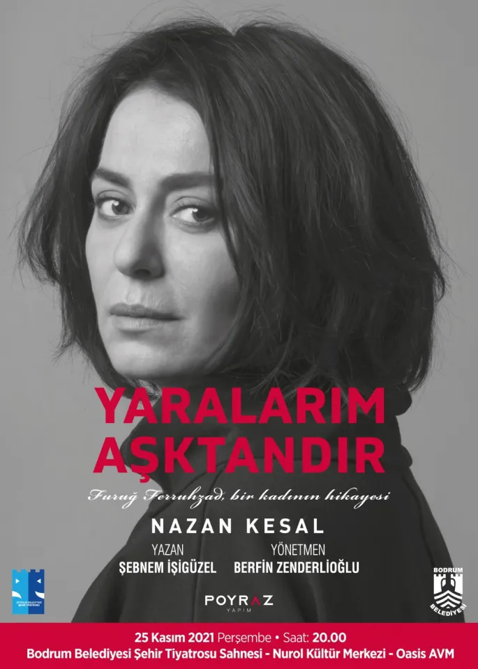 “Yaralarım Aşktandır” adlı tek kişilik oyunuyla, Nazan Kesal, İran’ın güçlü kadın şairi Furuğ Ferruhzad’ı oynuyor. Yazar Şebnem İşigüzel’in kaleme aldığı ve Berfin Zenderlioğlu’nun yönettiği oyun, İran şiirinin isyankar sesi Füruğ Ferruhzad’ın nefesini, tiyatro sahnesine taşıyor.