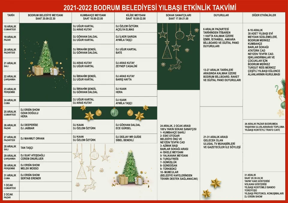 Bodrum Belediyesi Kültür ve Sosyal İşler Müdürlüğü tarafından organize edilen, 18 Aralık akşamı meydanlarda DJ performansları ve sokak sanatçıları ile başlayacak olan yılbaşı şenliği programı şöyle: