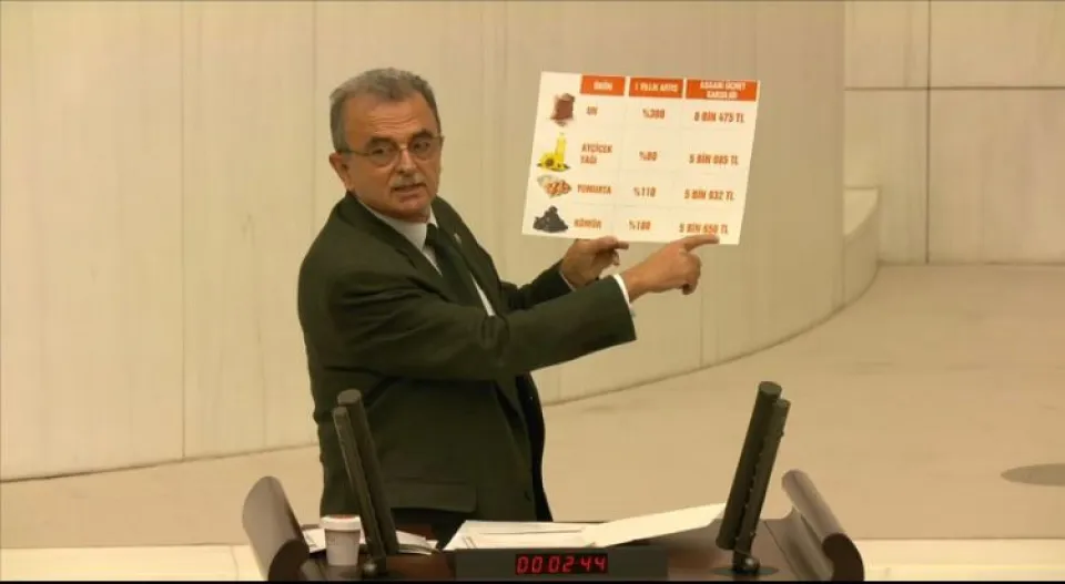 Asgari ücreti un fiyatına göre endekslersek 8.475 lira olması lazım, ayçiçek yağına göre endekslersek 5.085 lira olması lazım, yumurta fiyatına göre endekslersek 5.932 lira olması lazım, kömür fiyatına endekslersek 5.650 lira olması lazım bu da yerli kömür, ithal demiyorum.