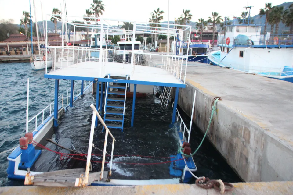 Yalıkavak Koyu'ndaki beton iskelede uzun süre bağlı duran, fırtınada da hasar gören teknenin ön kısmı parçalandı ve bir bölümü battı.