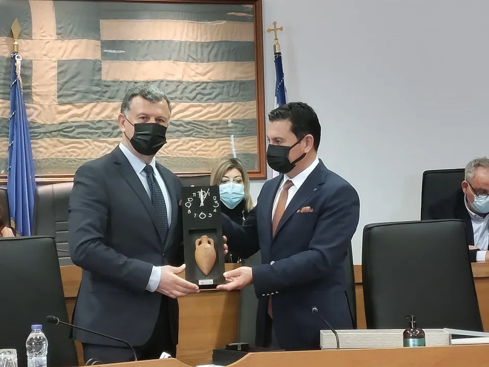 Başkan Nikitaras tarafından sıcak bir şekilde karşılanan Başkan Aras ve beraberindekiler ilk olarak Kos Belediye Meclis Salonu'nda ağırlandı.