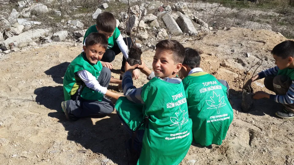 Fethiye Erozyonla Mücadele, Ağaçlandırma ve Doğayı Koruma Derneği, Orman haftası başlamadan miniklerle okulun bahçesine fidan dikti.