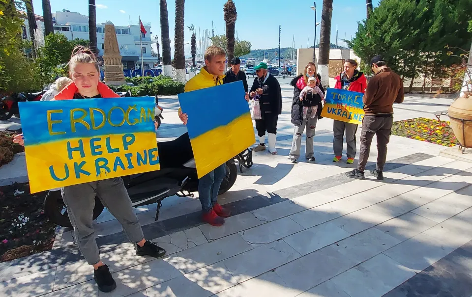 Bodrum Belediyesi önüne gelen Ukraynalı aile, ellerindeki İngilizce yazılı pankartlarla Cumhurbaşkanı Recep Tayyip Erdoğan'dan yardım istedi.