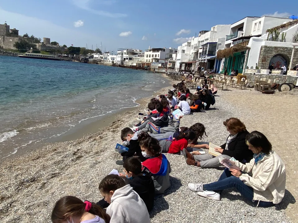 Bodrum ilçesinde, 58. Kütüphane Haftası kapsamında öğrenciler, öğretmenler ve vatandaşlar açık havada kitap okudu.