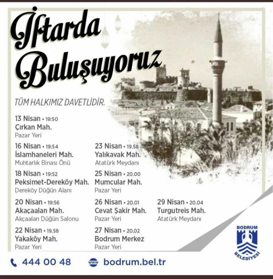 Bodrum Belediye Başkanı Ahmet Aras, “Birlik beraberliğe ve dayanışmaya çok daha fazla ihtiyaç duyduğumuz şu günlerde ramazan ayında kıymetli halkımızla buluşacak ve aynı sofrayı paylaşacak olmaktan dolayı mutluluk duyuyorum. Yapılan ibadetlerin, tutulan oruçların ve edilen duaların kabul olmasını diliyor, tüm mahalle sakinlerimizi iftar sofralarımıza bekliyorum” dedi.