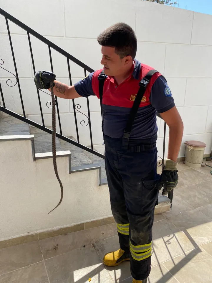 Bodrum ilçesinde bir evin deposuna giren yılan, itfaiye ekibince yakalanarak doğaya salındı.