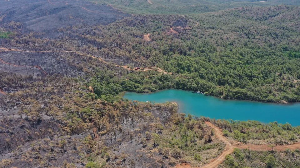 Öte yandan, yangında zarar gören 4 bin 500 hektarlık ormanlık alan ve yapılan soğutma çalışmaları dron ile havadan görüntülendi.