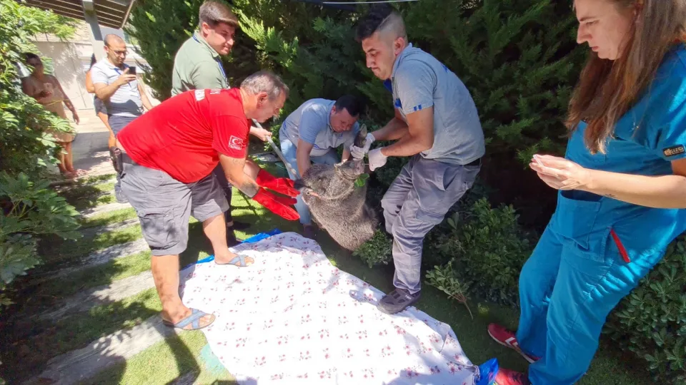 Konacık Mahallesi Babürşah Caddesi'nde, bir evin bahçesinde yaralı yaban domuzu girdiği ihbarını alan Bodrum Belediyesi ve Muğla 911 Arama Kurtarma Araştırma Derneği ekipleri adrese gitti.