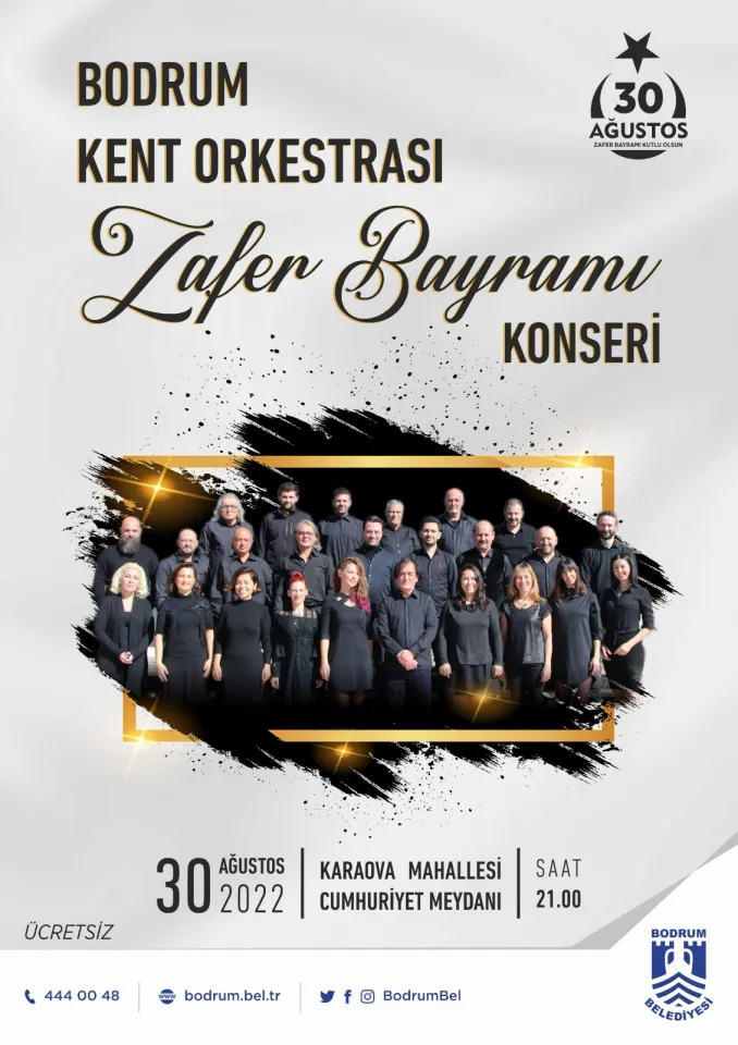 30 Ağustos Salı günü, büyük zaferin 100.yılı dolayısıyla sabah saatlerinde düzenlenecek törenlerin ardından akşam saatlerinde Bodrum Belediye Meydanı'nda ve Karaova Mahallesi Cumhuriyet Meydanı’nda ücretsiz halk konserleri gerçekleştirilecek.