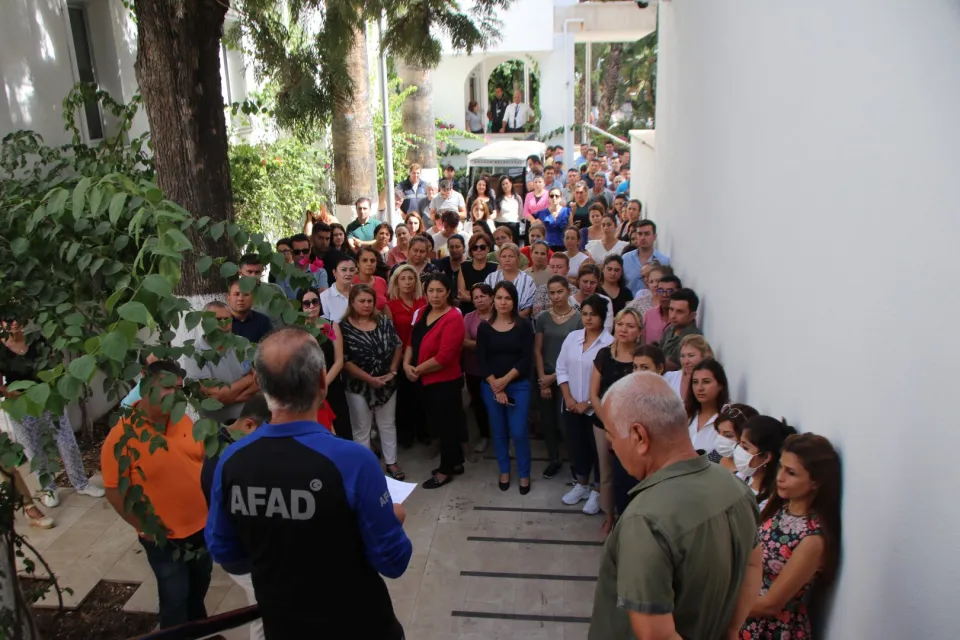 AFAD Muğla İl Müdürlüğü personelleri Eğitim Uzmanı Koray Ece ve Şef Zuhal Yorulmaz tarafından Bodrum Belediyesi personellerine yönelik deprem anı uygulaması, afet ve acil durum eğitimi verilerek deprem tahliye tatbikatı gerçekleştirildi.