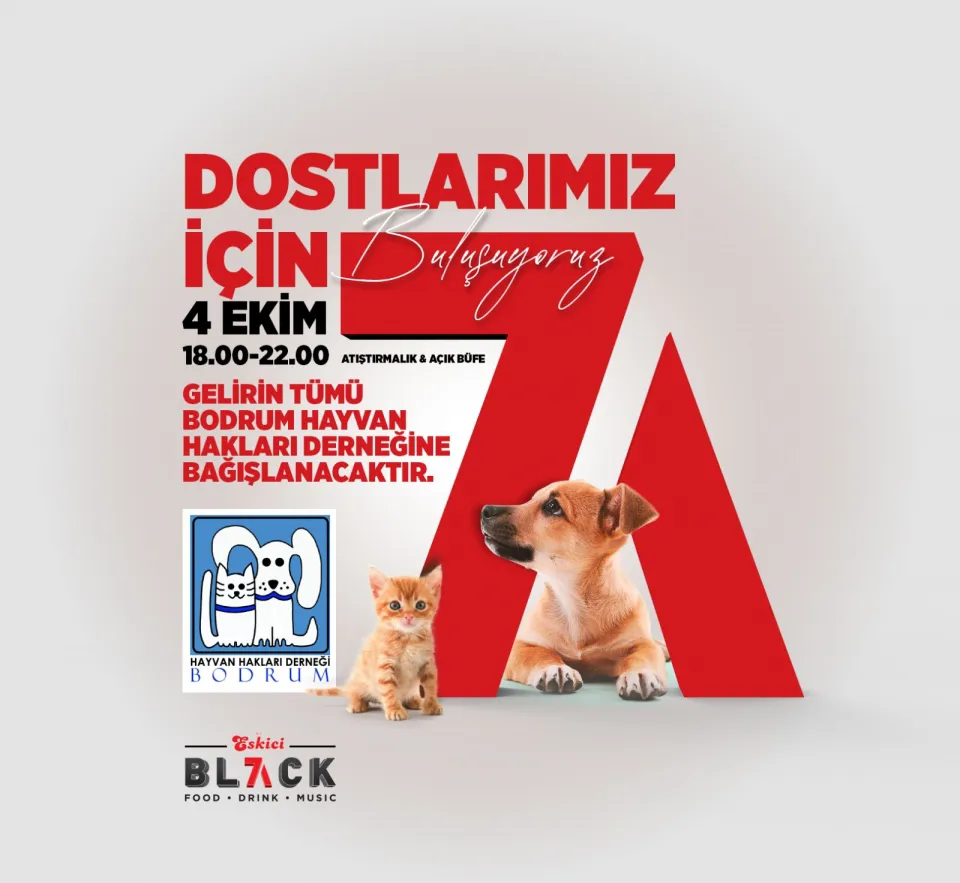 4 Ekim 2022 günü 18.00 – 22.00 saatleri arasında düzenlenecek etkinlikte atıştırmalıklar ve açık büfe ile içeceklerden oluşan bir menü ile hizmet alacağınız Eskici Black7, 4 saat boyunca kazanacağı tüm geliri sokaklarda yaşayan canlar için Bodrum Hayvan Hakları Derneği’ne bağışlayacak.