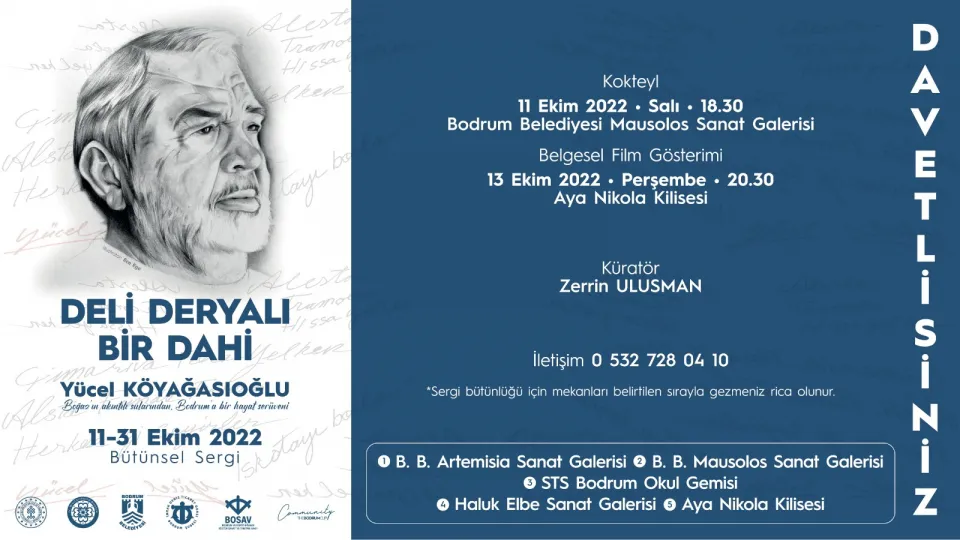 Kültür ve Turizm Bakanlığı, Muğla Büyükşehir Belediyesi, Bodrum Belediyesi, BOSAV, İMEAK Deniz Ticaret Odası Bodrum Şubesi ve Bodrum Cup destekleriyle Küratör Zerrin Ulusman tarafından gerçekleştirilen Deli Deryalı Bir Dâhi “Yücel Köyağasıoğlu” Projesi kapsamındaki bütünsel sergi, Bodrum’da açılıyor.