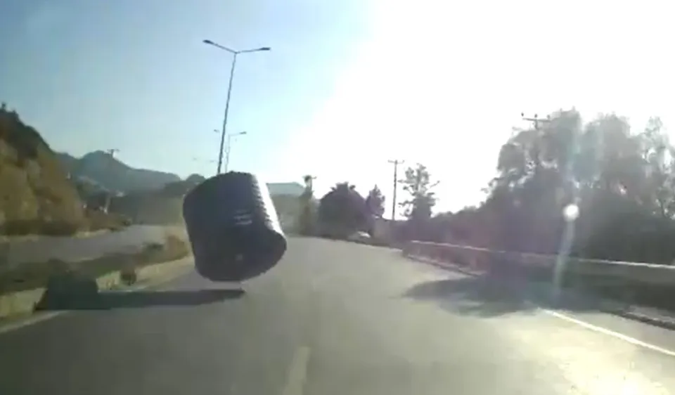 Öte yandan, Kars'ın atlattığı tehlike, aracının kamerasına yansıdı. Görüntüde, diğer yönde ilerleyen kamyonetin kasasından fırlayan su tankının refüje çarpması, Kars'ın ani manevrasıyla tanktan kurtulması yer alıyor