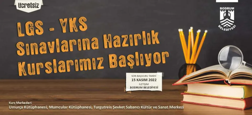 Bodrum Belediyesi hayata geçirilen yeni projelerle eğitime olan desteğini sürdürürken eğitim öğretim destekleri kapsamında Liselere Geçiş Sistemi (LGS), Yükseköğretim Kurumları Sınavı(YKS), ilkokul ödev ve ders hazırlık kurslarını ücretsiz olarak 21 Kasım 2022 Pazartesi günü başlatıyor.