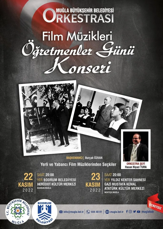 24 Kasım Öğretmenler Günü’nde Muğla Büyükşehir Belediyesi farklı etkinlikler düzenleyecek. 22 Kasım’da Bodrum Belediyesi işbirliği ile Muğla Büyükşehir Belediyesi Orkestrası tarafından “Film Müzikleri Öğretmenler Günü Konseri” Herodot Kültür Merkezi’nde kutlanacak. Aynı etkinlik 23 Kasım’da Gazi Mustafa Kemal Atatürk Kültür Merkezi Yıldız Kenter sahnesinde sanatseverlerle buluşacak. Film Müzikleri Orkestrası Öğretmenler Günü konserinde orkestra şefi Hasan Niyazi Tura, başkemancı Burçak Özkan olacak.