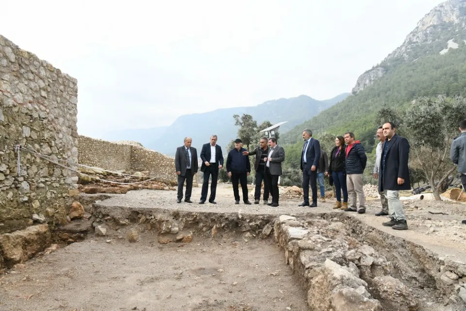 Muğla Valisi Orhan Tavlı yeni kalıntıların bulunduğu Akyaka Orta Çağ Kalesinde incelemelerde bulundu kazı başkanı ve Muğla Sıtkı Koçman Üniversitesi Arkeoloji Bölümü Öğretim Üyesi Prof. Dr. Abdulkadir Baran’dan çalışmalar hakkında bilgi aldı.