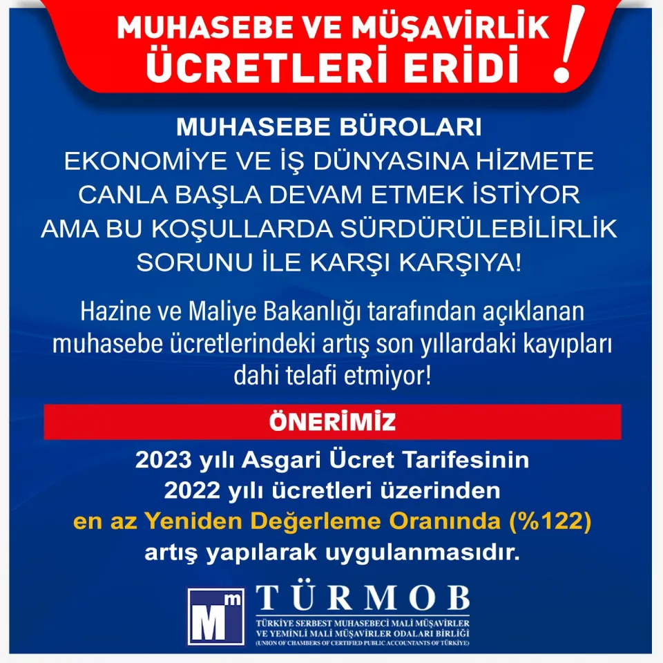 Hazine ve Maliye Bakanlığı tarafından 30 Aralık 2022 tarihli Resmi Gazete’de açıklanan muhasebe ücretlerindeki yüzde 85’lik artış, bürolarımızın yaşadığı büyük sıkıntıyı telafi etmeyeceğinden, ücretlerin en az yeniden değerleme oranı olan yüzde 122 oranında artırılarak uygulanması gerekmektedir.”