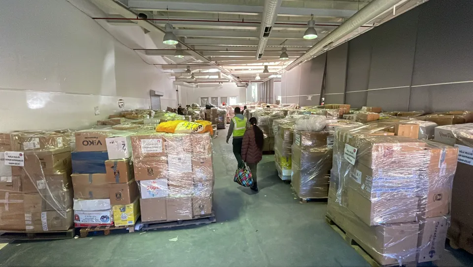 Malzemeler burada ayrıştırılıp kolilere konulduktan sonra tırlara yükleniyor.