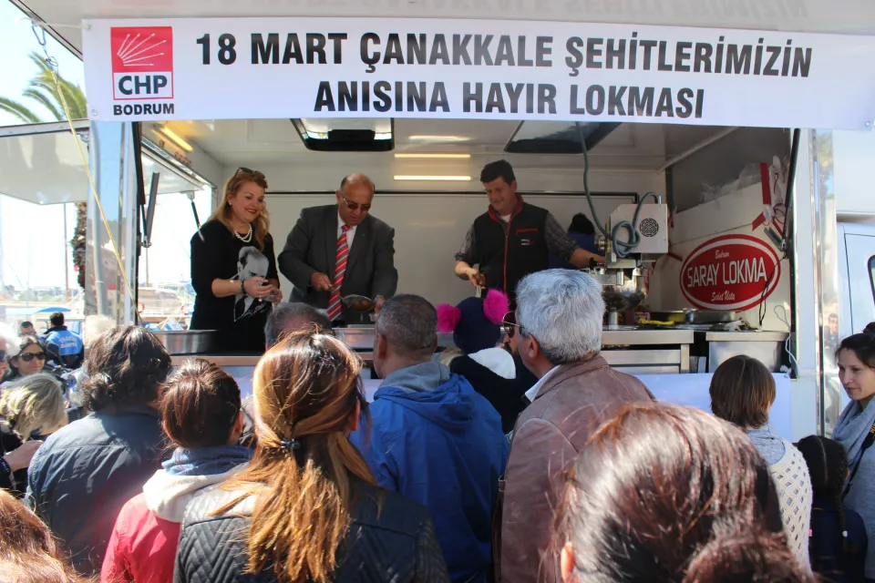 Çanakkale Şehitleri hayrına döktürülen lokmaya ilgi gösteren vatandaşlar dualar etti. CHP Bodrum İlçe Başkanı Recai Seymen; “102. yıl dönümünü yaşadığımız bugün, 18 Mart Çanakkale Zaferi ve Şehitleri Anma Gününde Türkiye Cumhuriyeti’nin kurucusu ve mimarı büyük Önder Gazi Mustafa Kemal Atatürk ve aziz şehitlerin anısına lokma döktürdük. Her yıl düzenli olarak şehitlerimizin ruhuna lokma döktürüyoruz. Bu yılda geleneğimizi sürdürerek şehitlerimizin ruhuna lokma hayrımızı yaptık. Ruhları şad olsun” dedi.