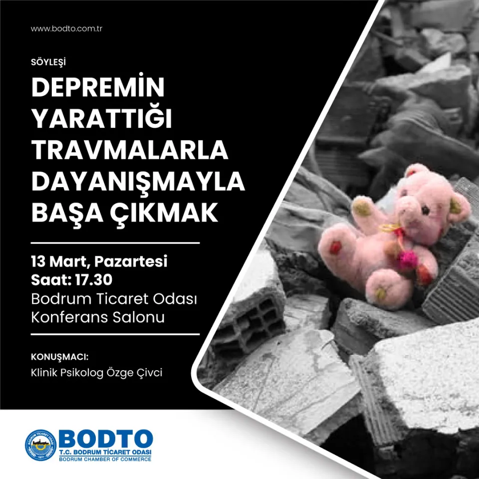 Bodrum Ticaret Odası (BODTO) 6 Şubat tarihinde gerçekleşen Kahramanmaraş merkezli depremlerin ardından depremzedelerin hayatlarına sağlıklı şekilde devam edebilmelerine yönelik çalışmalar yürütmeye devam ediyor. Bu kapsamda BODTO 8 Nolu Meslek Komitesinin öncülüğünde, Klinik Psikolog Özge Çivci’nin katılımı ile 13 Mart Pazartesi günü 17.30’da BODTO Konferans Salonunda “Depremin Yarattığı Travmalarla Dayanışmayla Başa Çıkmak” konulu bir söyleşi yapılacak.