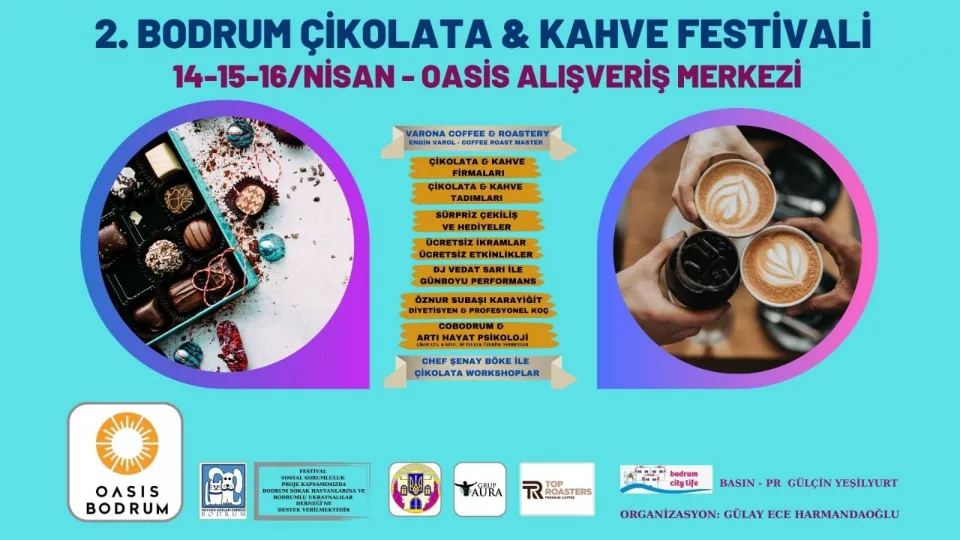 Bu sene Bodrum’da 2.si gerçekleşecek olan Çikolata & Kahve Festivali, 14-16 Nisan 2023 tarihlerinde Oasis Alışveriş Merkezinde ziyaretçilerini ağırlayacak. Damakların şenleneceği bu özel festivalde kahve çikolata tutkunları farklı tatları deneyimleme fırsatı bulacak. Birçok markanın yeni ürünlerini meraklılarıyla ilk kez buluşturacağı festivalde dopdolu 3 gün yaşanacak.