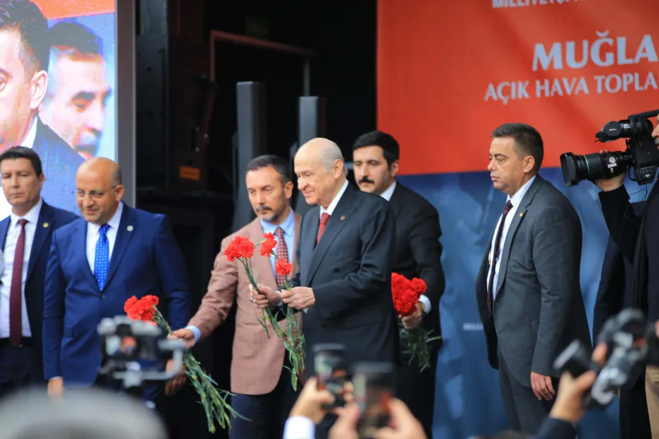 Konuşmasının ardından katılımcılara karanfil dağıtan Bahçeli, MHP Muğla milletvekili adaylarıyla meydandakileri selamladı.