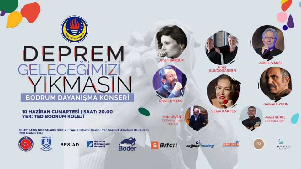 10 Haziran’da ünlü isimlerin TED Bodrum Koleji’nde sahne alacağı dayanışma konserinin tüm geliri depremde anne babasını kaybeden çocukların eğitimine katkı sağlamak amacıyla Türk Eğitim Derneği’nin “Deprem Geleceğimizi Yıkmasın” kampanyasına bağışlanacak.