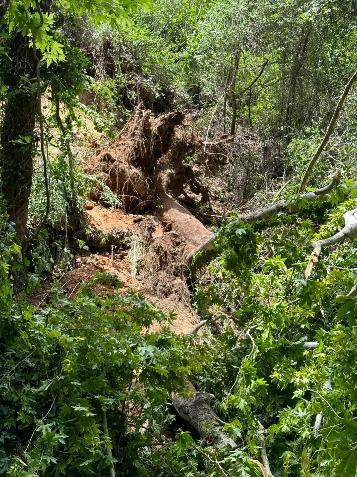 Kayadibi Mahallesi'ndeki şelaleye giden turistlerin üzerine, yağış nedeniyle kök kısmında boşluk oluştuğu belirlenen ağaç devrildi.