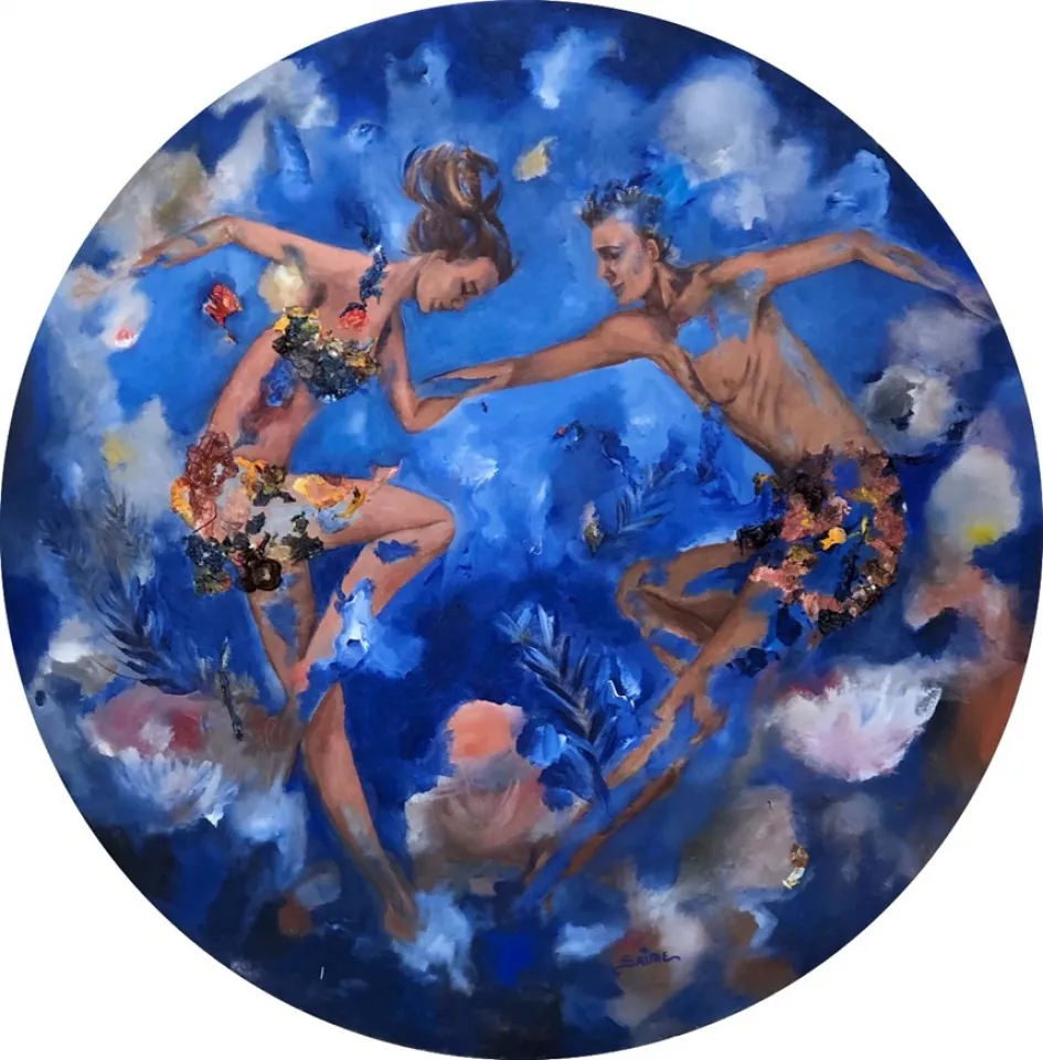 “En çok, yaşanmışlıklarımın derinliklerinden öğrendim. Kimi zaman kayboldum, kimi zaman güçlendim ve duygularımı, hakkını vererek yaşamayı öğrendim. Yaşadığımız her an evrende bir iz bırakıyor.” diyen sanatçı, hayatın arka planına dair farkettiğimiz veya farkedemediğimiz izleri de uçuşan renkler, dans eden figürler ve semboller olarak çalışmalarına yansıtıyor.