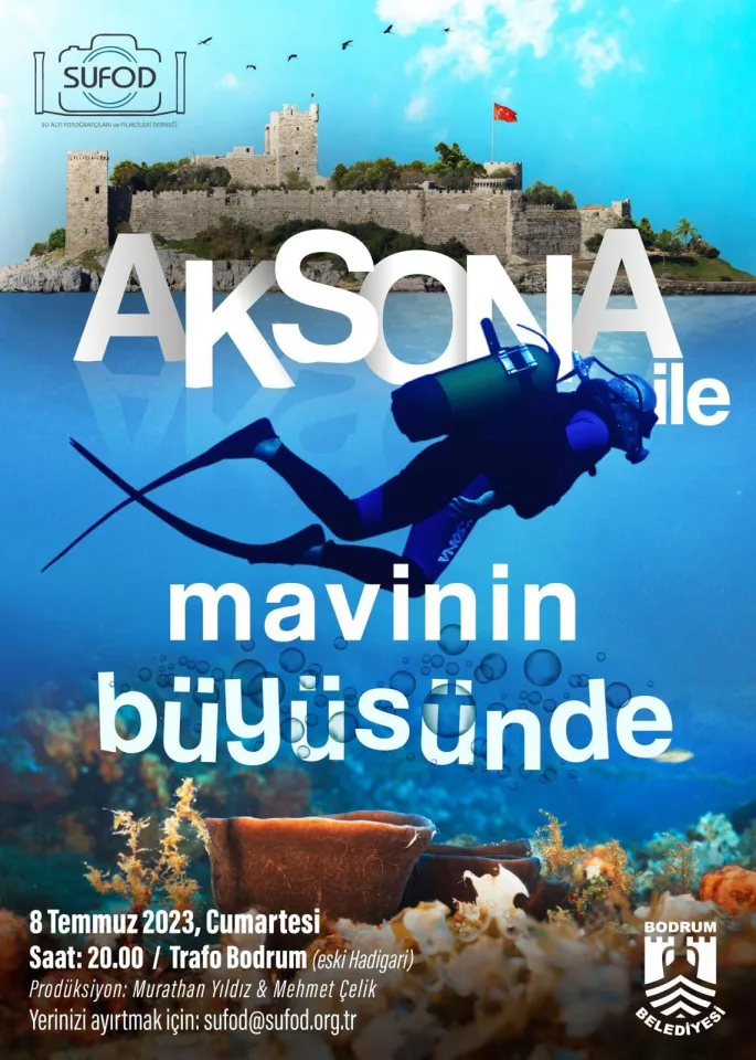 Sünger avcısı Mehmet Baş küçük yaşında aşık olduğu deniz serüvenine, bugün 18 m.'lik AKSONA MANCORNA adlı tirhandiliyle, denizlerimizi yerli ve yabancı turistlere tanıtma hizmeti vererek devam ediyor. Su altı görüntüleri ile beraber, Mehmet Baş ve sevenlerinin katkılarıyla hazırlanan “AKSONA İLE MAVİNİN BÜYÜSÜNDE” adlı belgesel filmimiz 8 Temmuz 2023 Cumartesi akşamı saat 20.00'da Bodrum Belediyesi'nin katkılarıyla Trafo Bodrum'da ilk kez izleyicisiyle buluşacak.