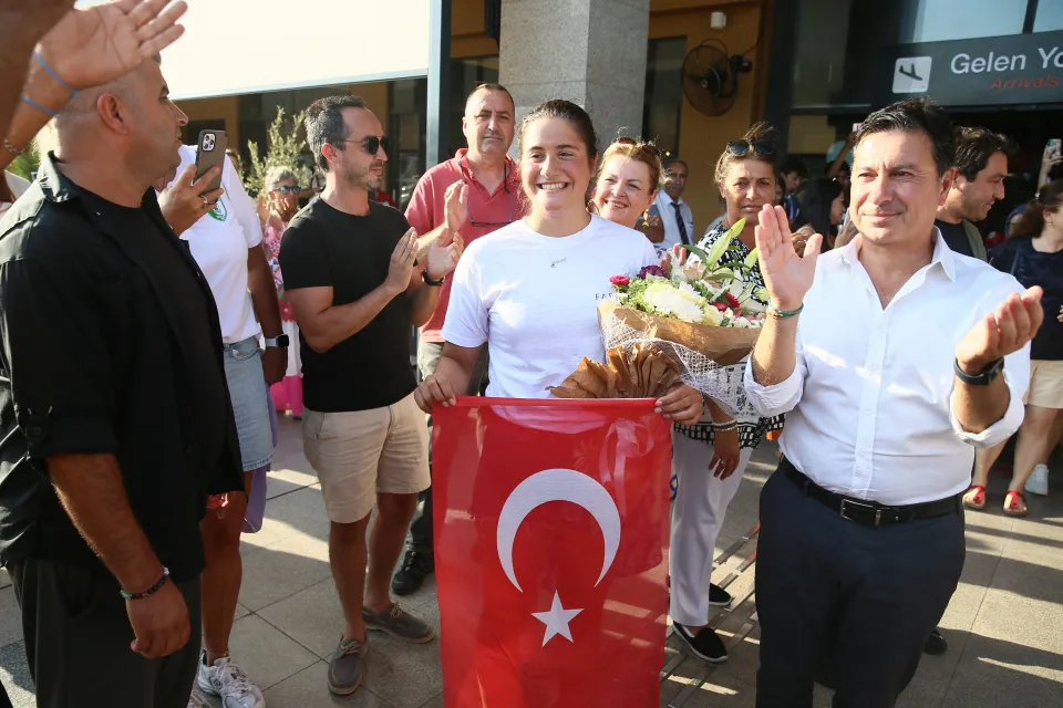 Aysu Türkoğlu'nun da içerisinde olduğu uçak, akşam saatlerinde Milas-Bodrum Havalimanı'na indi. Uçaktan inen 22 yaşındaki sporcu, gelen yolcu bölümünde ailesi ve arkadaşları başta olmak üzere, Bodrum Belediye Başkanı Ahmet Aras, Bodrum Belediye Meclis Üyesi Emel Çakaloğlu, Bodrumspor Derneği Yüzme Şubesi ve Bodrum Bandosu tarafından karşılandı.