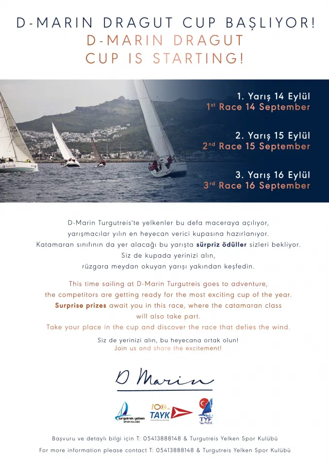 Yılın en heyecan verici yarışması D-Marin Dragut Cup 14-16 Eylül’de D-Marin Turgutreis gerçekleşecek. Rüzgara meydan okuyan yarış, D-Marin ev sahipliğinde, Turgutreis Yelken Kulübü, Türkiye Açıkdeniz Yarış Kulübü (TAYK) ve Türkiye Yelken Federasyonu (YYF) iş birliğinde düzenlenecek.