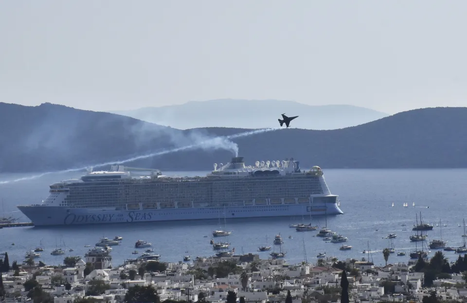 Bodrum Limanı'nda demirli kruvaziyerdeki yolcular da gösteriyi gemiden izledi. SOLOTÜRK'ün gösterisi izleyenlerin beğenisini topladı.