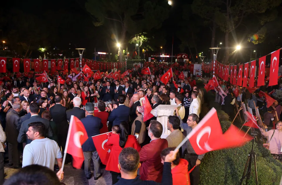 "Bugün en büyük bayram günü. Tarihe geçecek bu anlamlı ve büyük günü tüm Türkiye'de olduğu gibi Muğla'mızda da huzur ve güven içinde büyük bir gururla kutluyoruz. Bu gururu bizlere yaşatan Cumhuriyet'imizin kurucusu Gazi Mustafa Kemal Atatürk ve silah arkadaşları başta olmak üzere, şanlı ecdadımızı, kanlarıyla bu toprakları vatan yapan aziz şehitlerimizi, kahraman gazilerimizi, rahmet, minnet ve şükranla yad ediyorum."