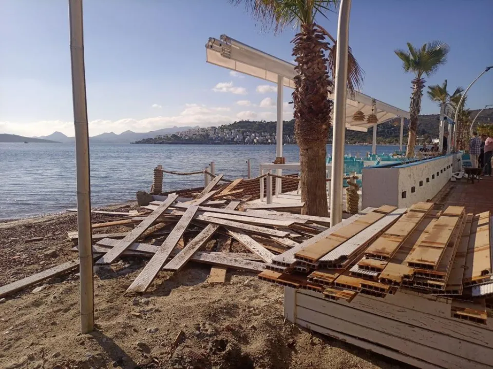 Belediye ekiplerinin müdahalesi sonucu, Bitez sahilde kıyı işgaline sebep olan ahşap platform sökülüyor