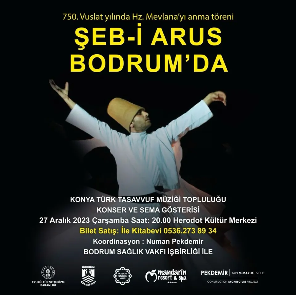 Konya Türk Tasavvuf Müziği Topluluğu Konseri ve Sema Mukabelesi, 27 Aralık 2023 Çarşamba akşamı saat 20.00 de Konacık Mahallesi’ndeki Herodot Kültür Merkezi’nde Şeb-i Arus töreni gerçekleştirecek. Etkinlik gelirinin bir bölümü Bodrum Sağlık Vakfı’na aktarılacak.