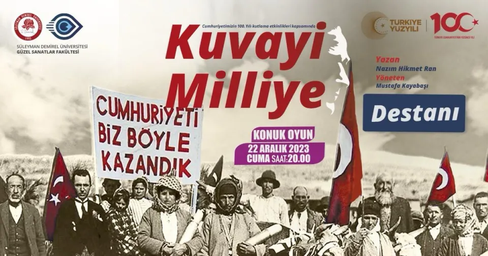 Nâzım Hikmet Ran’ın Kurtuluş Savaşı eserindeki Kuvayi Milliye Destanından bazı bölümler, toplu sanat gösterimi olarak Süleyman Demirel Üniversitesi Güzel Sanatlar Fakültesi Sahne Sanatları Bölümü ve Akademik Oda Orkestrası tarafından sahnelendi. Oyunun yönetmenliğini Dr. Mustafa Kayabaşı yaparken öğrenciler Nur Sima, Fırat Meriç Kızıloğlu ile Ahmetcan Özer, özgürlük mücadelesi sırasında yaşanan ağır koşulları ve Anadolu halkının çaresizliklerini tarihsel anlatıyla sahneye taşıyor.