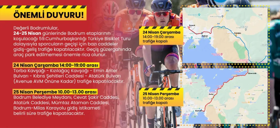 59. Cumhurbaşkanlığı Bisiklet Turu, 24-25 Nisan tarihlerinde Bodrum'da gerçekleşecek. Yarış esnasında bazı yollar trafiğe kapanacak, yol üzerine araç parkına izin verilmeyecek.