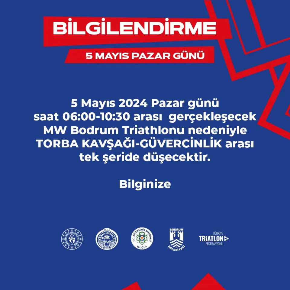 Bodrum Belediyesi'nden yarışlarla ilgili yapılan duyuruda "5 Mayıs, Pazar Günü saat 06.00-10.30 arası gerçekleşecek Bodrum Triatlonu nedeniyle Torba - Kavşağı Güvercinlik arası tek şeride düşecektir." denildi.